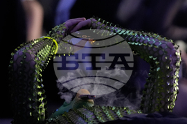 A woman donning a medusa headpiece poses for a photo during a Halloween rave in Kyiv, Ukraine, Saturday, Oct. 25, 2025. (AP Photo/Julia Demaree Nikhinson)