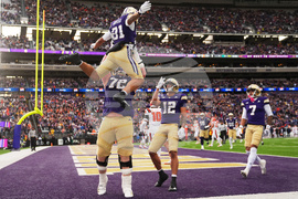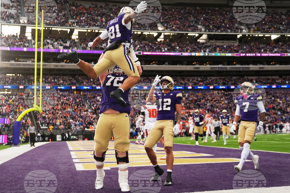 Washington offensive lineman John Mills (72) lifts up wide receiver Dezmen Roebuck (81) to celebrate Roebuck's touchdown catch against Illinois during the first half of NCAA college football game, Saturday, Oct. 25, 2025, in Seattle. (AP Photo/Lindsey Wasson)