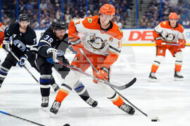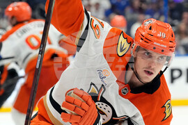 Anaheim Ducks left wing Cutter Gauthier (61) gets around Tampa Bay Lightning left wing Brandon Hagel (38) during the first period of an NHL hockey game Saturday, Oct. 25, 2025, in Tampa, Fla. (AP Photo/Chris O'Meara)