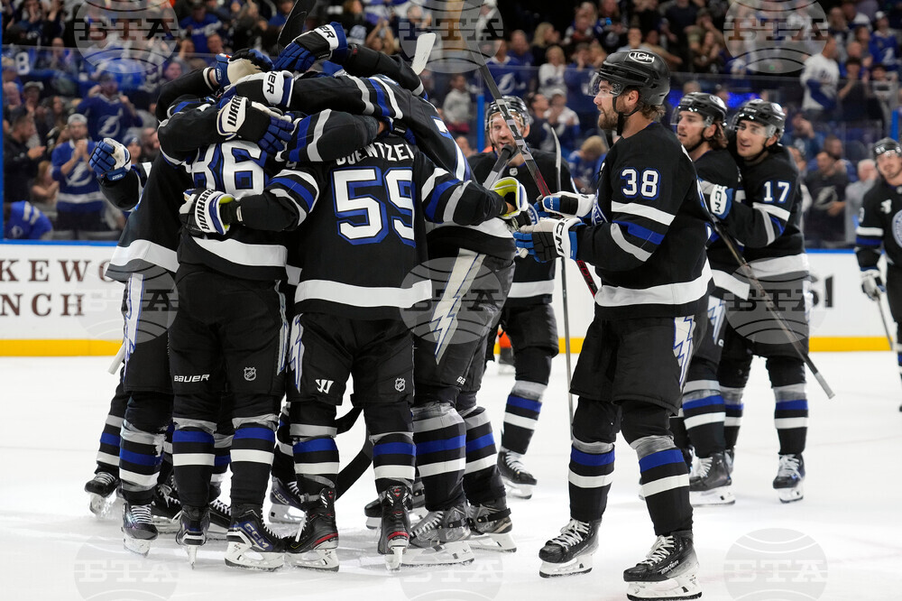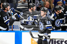 Tampa Bay Lightning center Jake Guentzel (59) celebrates with the bench after his goal against the Anaheim Ducks during the first period of an NHL hockey game Saturday, Oct. 25, 2025, in Tampa, Fla. (AP Photo/Chris O'Meara)