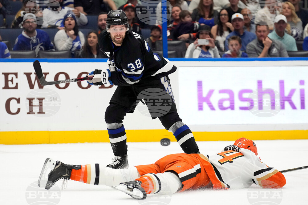 Anaheim Ducks defenseman Ian Moore, on ice, goes down low to block a shot by Tampa Bay Lightning left wing Brandon Hagel (38) during the second period of an NHL hockey game Saturday, Oct. 25, 2025, in Tampa, Fla. (AP Photo/Chris O'Meara)