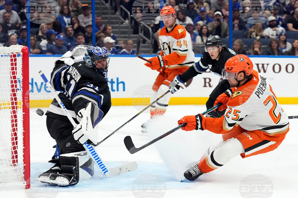 Anaheim Ducks goaltender Lukas Dostal (1) stops a shot by Tampa Bay Lightning center Brayden Point (21) during the second period of an NHL hockey game Saturday, Oct. 25, 2025, in Tampa, Fla. (AP Photo/Chris O'Meara)