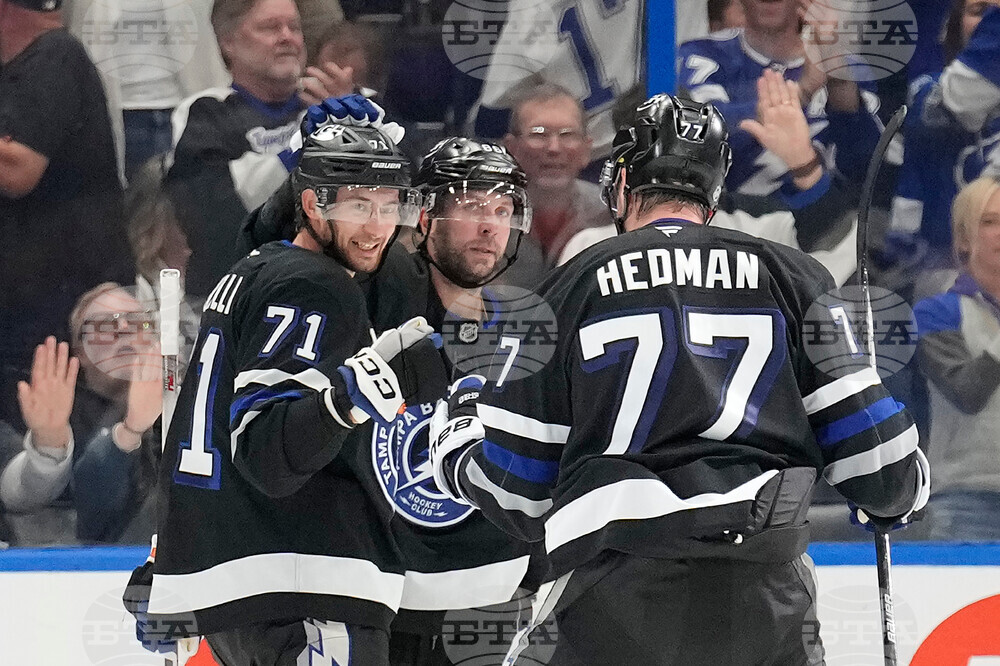Tampa Bay Lightning center Anthony Cirelli (71) celebrates his goal against the Anaheim Ducks with defenseman Victor Hedman (77) and right wing Nikita Kucherov during the third period of an NHL hockey game Saturday, Oct. 25, 2025, in Tampa, Fla. (AP Photo/Chris O'Meara)