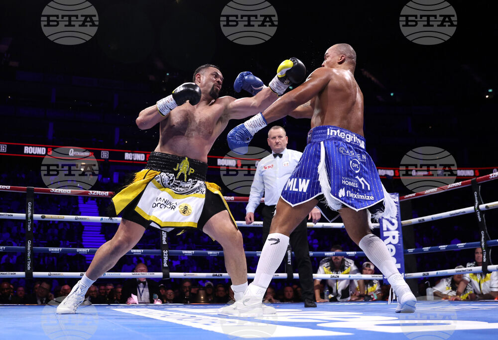 Joseph Parker, left, and Fabio Wardley battle during a WBO world heavyweight title bout in, London, England, Saturday, Oct. 25, 2025. (Steven Paston/PA via AP)