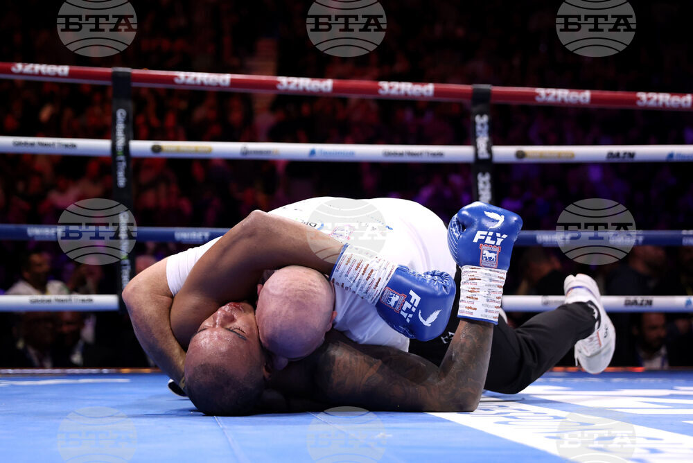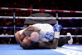 Fabio Wardley, left, falls to the mat after his win over over Joseph Parker in a WBO world heavyweight title bout in London, England, Saturday, Oct. 25, 2025. (Steven Paston/PA via AP)