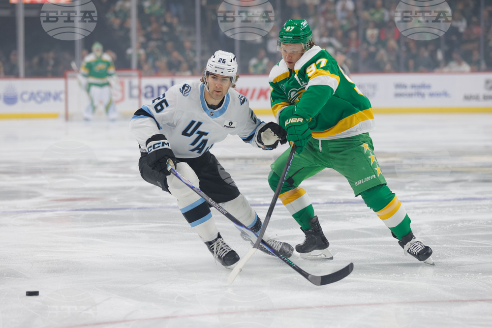 Minnesota Wild left wing Kirill Kaprizov (97) and Utah Mammoth defenseman Dmitri Simashev (26) battle for the puck during the first period of an NHL hockey game Saturday, Oct. 25, 2025, in St. Paul, Minn. (AP Photo/Bailey Hillesheim)
