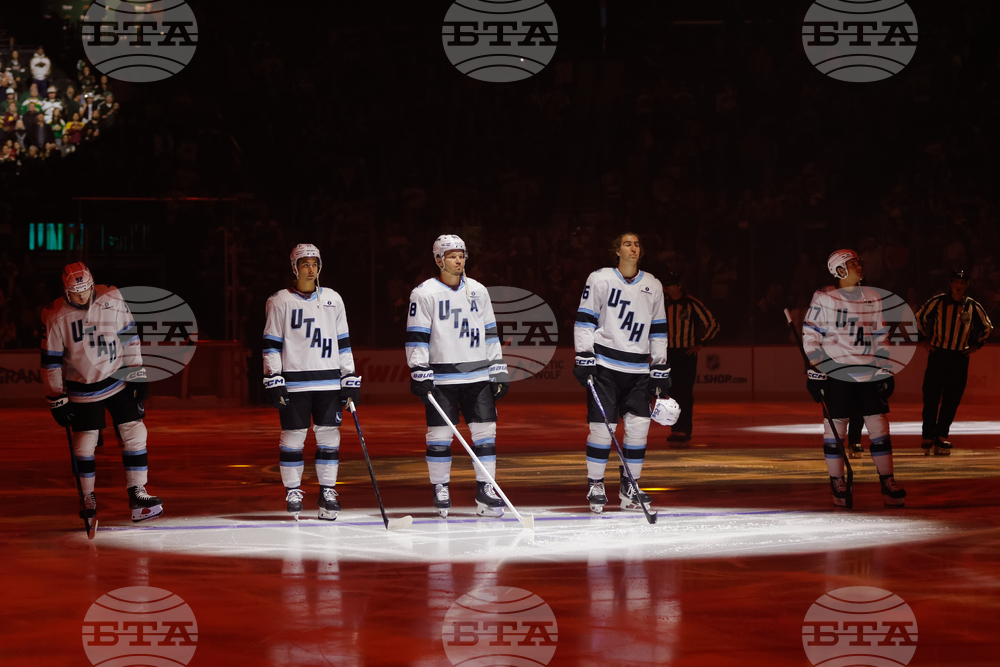 Utah Mammoth players stand on the blue line before an NHL hockey game against the Minnesota Wild, Saturday, Oct. 25, 2025, in St. Paul, Minn. (AP Photo/Bailey Hillesheim)