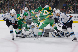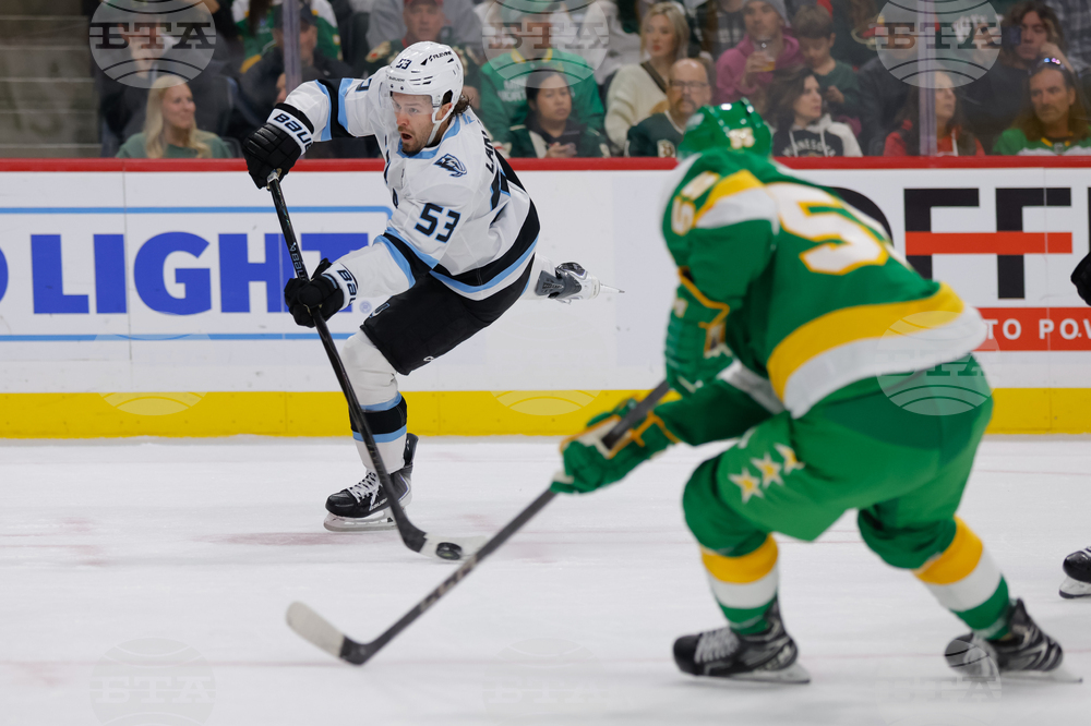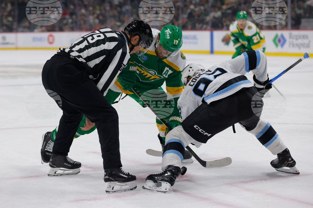 The Utah Mammoth and the Minnesota Wild battle for the puck during the first period of an NHL hockey game Saturday, Oct. 25, 2025, in St. Paul, Minn. (AP Photo/Bailey Hillesheim)