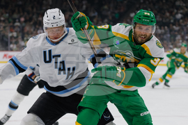 Minnesota Wild right wing Ryan Hartman (38) and Utah Mammoth defenseman Olli Määttä (2) battle for position during the first period of an NHL hockey game Saturday, Oct. 25, 2025, in St. Paul, Minn. (AP Photo/Bailey Hillesheim)