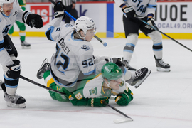 Utah Mammoth center Logan Cooley (92) falls on Minnesota Wild defenseman Zeev Buium (8) during the first period of an NHL hockey game Saturday, Oct. 25, 2025, in St. Paul, Minn. (AP Photo/Bailey Hillesheim)