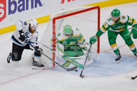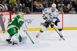 Minnesota Wild defenseman David Jiricek (55) takes a slapshot during the first period of an NHL hockey game against the Utah Mammoth, Saturday, Oct. 25, 2025, in St. Paul, Minn. (AP Photo/Bailey Hillesheim)