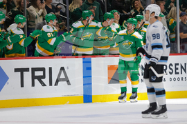 Minnesota Wild left wing Marcus Johansson (90) is congratulated after scoring during the second period of an NHL hockey game against the Utah Mammoth, Saturday, Oct. 25, 2025, in St. Paul, Minn. (AP Photo/Bailey Hillesheim)