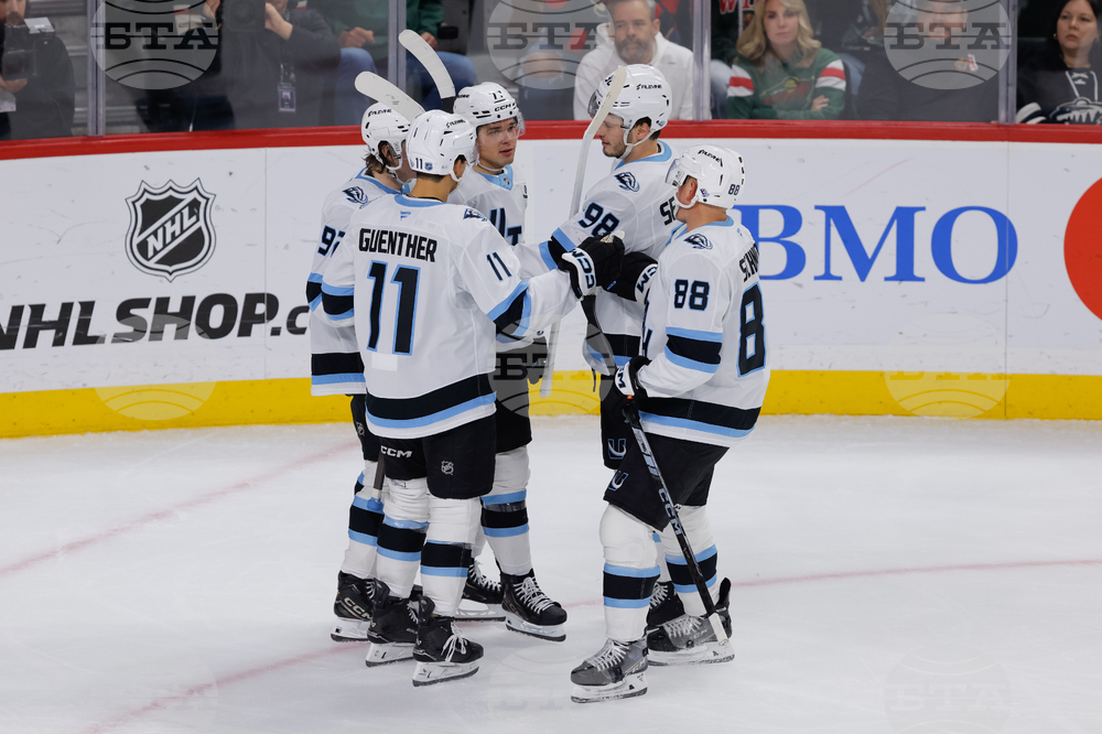 Utah Mammoth right wing JJ Peterka (77) celebrates with teammates after scoring during the third period of an NHL hockey game against the Minnesota Wild, Saturday, Oct. 25, 2025, in St. Paul, Minn. (AP Photo/Bailey Hillesheim)