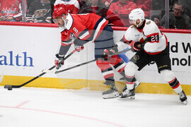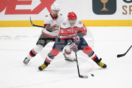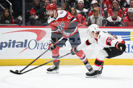 Washington Capitals center Nic Dowd (26) and Ottawa Senators center Dylan Cozens (24) chase the puck during the third period of an NHL hockey game, Saturday, Oct. 25, 2025, in Washington. (AP Photo/Nick Wass)