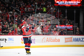 Washington Capitals left wing Alex Ovechkin (8) raises his stick to the crowd after he was recognized for playing in his 1,500th NHL hockey game during a break in the action in the first period against the Ottawa Senators, Saturday, Oct. 25, 2025, in Washington. (AP Photo/Nick Wass)