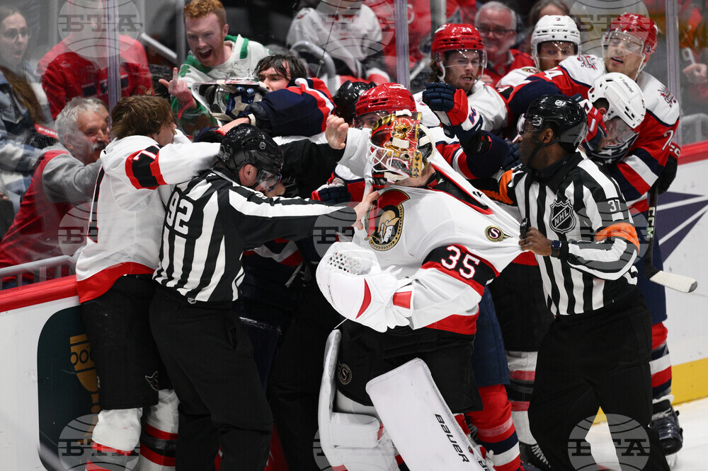The Washington Capitals and Ottawa Senators brawl during the second period of an NHL hockey game, Saturday, Oct. 25, 2025, in Washington. (AP Photo/Nick Wass)