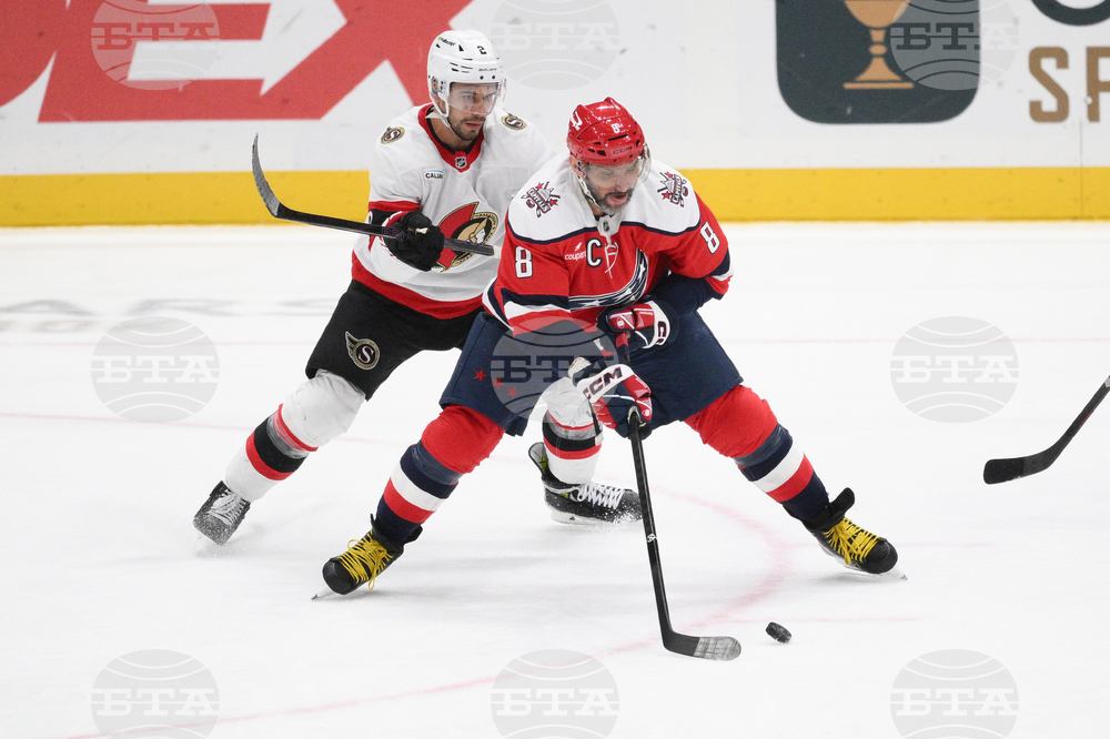 Washington Capitals left wing Alex Ovechkin (8) skates with the puck in front of Ottawa Senators defenseman Artem Zub (2) during the third period of an NHL hockey game, Saturday, Oct. 25, 2025, in Washington. (AP Photo/Nick Wass)
