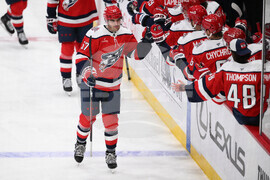 Ottawa Senators center Nick Cousins (21) celebrates his goal during the second period of an NHL hockey game against the Washington Capitals, Saturday, Oct. 25, 2025, in Washington. (AP Photo/Nick Wass)
