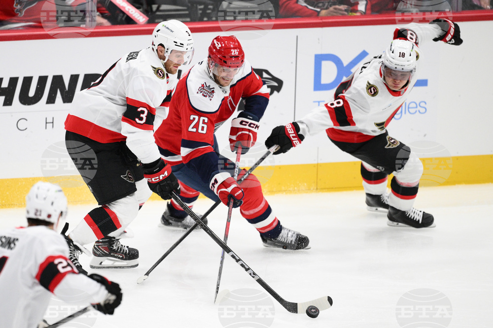 Ottawa Senators defenseman Nick Jensen (3) and center Tim Stützle (18) battle for the puck against Washington Capitals center Nic Dowd (26) during the second period of an NHL hockey game, Saturday, Oct. 25, 2025, in Washington. (AP Photo/Nick Wass)
