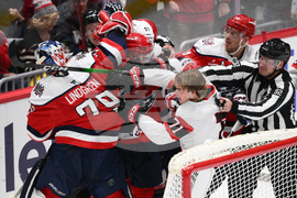 Ottawa Senators center Ridly Greig (71), Washington Capitals goaltender Charlie Lindgren (79) and others fight during the second period of an NHL hockey game, Saturday, Oct. 25, 2025, in Washington. (AP Photo/Nick Wass)
