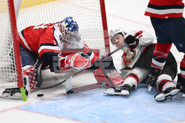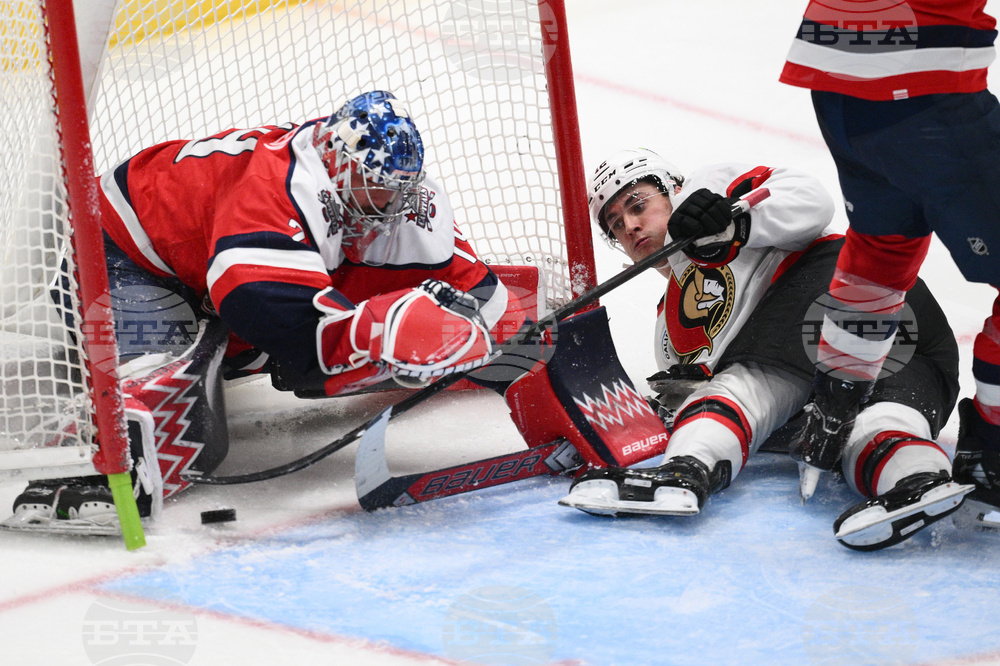 Ottawa Senators center Dylan Cozens (24) scores past Washington Capitals goaltender Charlie Lindgren (79) during the second period of an NHL hockey game, Saturday, Oct. 25, 2025, in Washington. (AP Photo/Nick Wass)