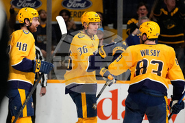 Nashville Predators left wing Cole Smith (36) is congratulated by defenseman Adam Wilsby (83) after Smith scored against the Los Angeles Kings during the second period of an NHL hockey game Saturday, Oct. 25, 2025, in Nashville, Tenn. (AP Photo/Mark Humphrey)