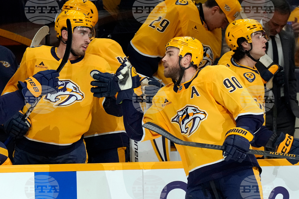 Nashville Predators center Ryan O'Reilly (90) is congratulated after scoring against the Los Angeles Kings during the first period of an NHL hockey game Saturday, Oct. 25, 2025, in Nashville, Tenn. (AP Photo/Mark Humphrey)
