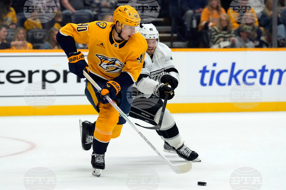 Nashville Predators center Fedor Svechkov, left, and Los Angeles Kings right wing Joel Armia, right, chase down the puck during the first period of an NHL hockey game Saturday, Oct. 25, 2025, in Nashville, Tenn. (AP Photo/Mark Humphrey)