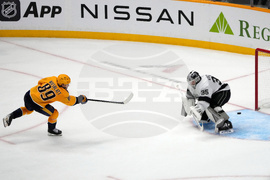 Nashville Predators right wing Ozzy Wiesblatt (89) scores against Los Angeles Kings goaltender Darcy Kuemper (35) for the winning goal during a shootout in an NHL hockey game Saturday, Oct. 25, 2025, in Nashville, Tenn. (AP Photo/Mark Humphrey)