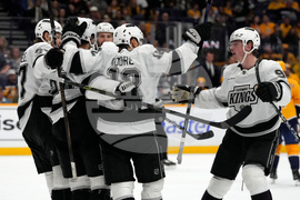 Los Angeles Kings right wing Corey Perry (10) is congratulated after scoring a goal against the Nashville Predators during the second period of an NHL hockey game Saturday, Oct. 25, 2025, in Nashville, Tenn. (AP Photo/Mark Humphrey)