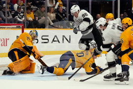 Nashville Predators left wing Cole Smith (36) scores a goal against Los Angeles Kings goaltender Darcy Kuemper (35) during the second period of an NHL hockey game Saturday, Oct. 25, 2025, in Nashville, Tenn. (AP Photo/Mark Humphrey)