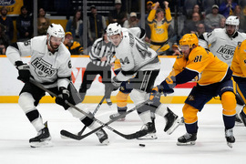 Los Angeles Kings defenseman Joel Edmundson (6) and Nashville Predators center Jonathan Marchessault (81) battle for the puck during overtime of an NHL hockey game Saturday, Oct. 25, 2025, in Nashville, Tenn. (AP Photo/Mark Humphrey)