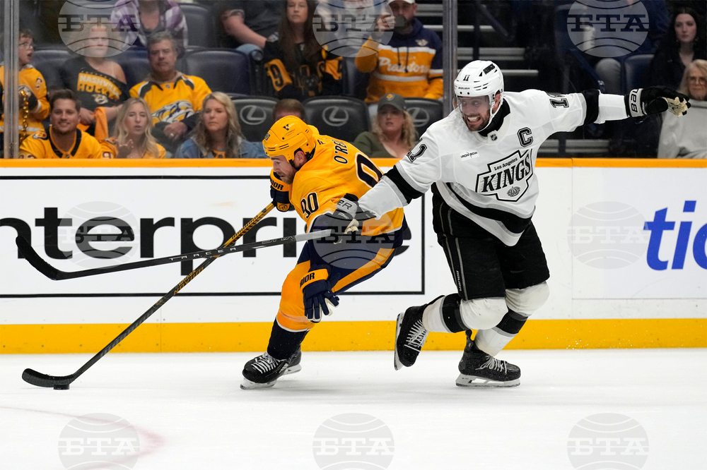 Los Angeles Kings center Anze Kopitar (11) tries to slow down Nashville Predators center Ryan O'Reilly (90) during overtime of an NHL hockey game Saturday, Oct. 25, 2025, in Nashville, Tenn. (AP Photo/Mark Humphrey)