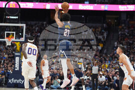Denver Nuggets guard Jamal Murray, center, goes up for a basket between Phoenix Suns forwards Oso Ighodaro, left, and Ryan Dunn (0) in the second half of an NBA basketball game Saturday, Oct. 25, 2025, in Denver. (AP Photo/David Zalubowski)