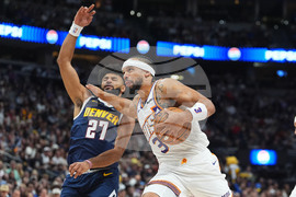 Phoenix Suns forward Dillon Brooks, front, drives past Denver Nuggets guard Jamal Murray (27) in the first half of an NBA basketball game Saturday, Oct. 25, 2025, in Denver. (AP Photo/David Zalubowski)