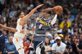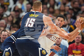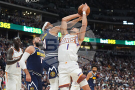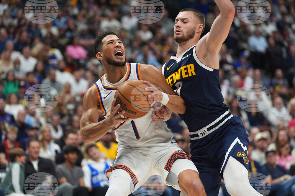 Denver Nuggets guard Bruce Brown, second from front right, fouls Phoenix Suns guard Devin Booker (1) who was driving to the basket in the first half of an NBA basketball game Saturday, Oct. 25, 2025, in Denver. (AP Photo/David Zalubowski)