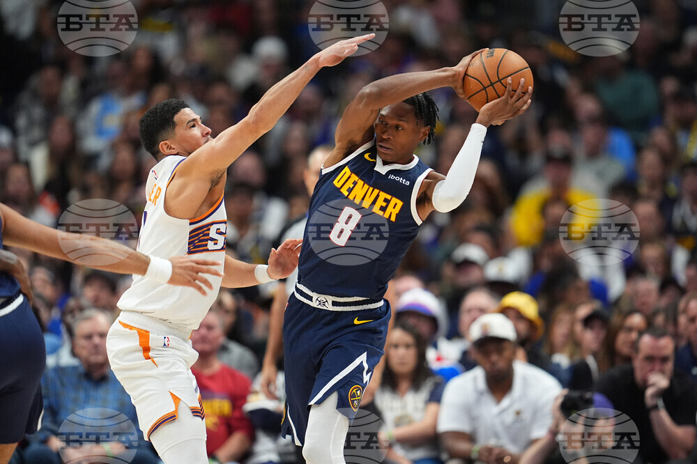 Denver Nuggets guard Peyton Watson, right, looks to pass the ball as Phoenix Suns guard Devin Booker, left, defends in the first half of an NBA basketball game Saturday, Oct. 25, 2025, in Denver. (AP Photo/David Zalubowski)