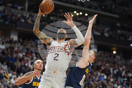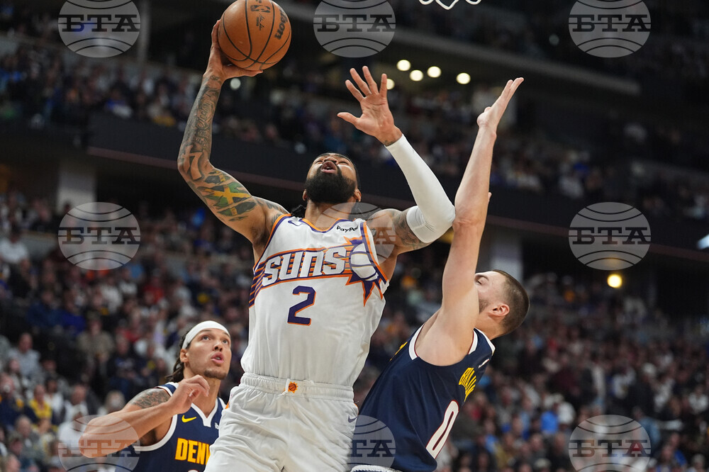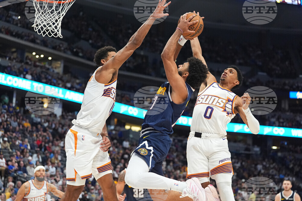 Phoenix Suns guard Grayson Allen, back left, goes up to shoot as Denver Nuggets guard Bruce Brown (11) and center Jonas Valanciunas (17) defend in the second half of an NBA basketball game Saturday, Oct. 25, 2025, in Denver. (AP Photo/David Zalubowski)