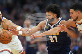 Denver Nuggets guard Jamal Murray, center, struggles to collect a loose ball as Phoenix Suns forward Dillon Brooks, left, and guard Devin Booker defend in the second half of an NBA basketball game Saturday, Oct. 25, 2025, in Denver. (AP Photo/David Zalubowski)
