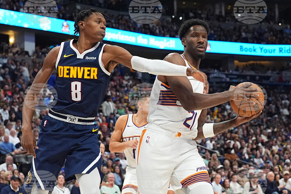 Phoenix Suns forward Nigel Hayes-Davis, right, pulls in a rebound as Denver Nuggets guard Peyton Watson defends in the second half of an NBA basketball game Saturday, Oct. 25, 2025, in Denver. (AP Photo/David Zalubowski)