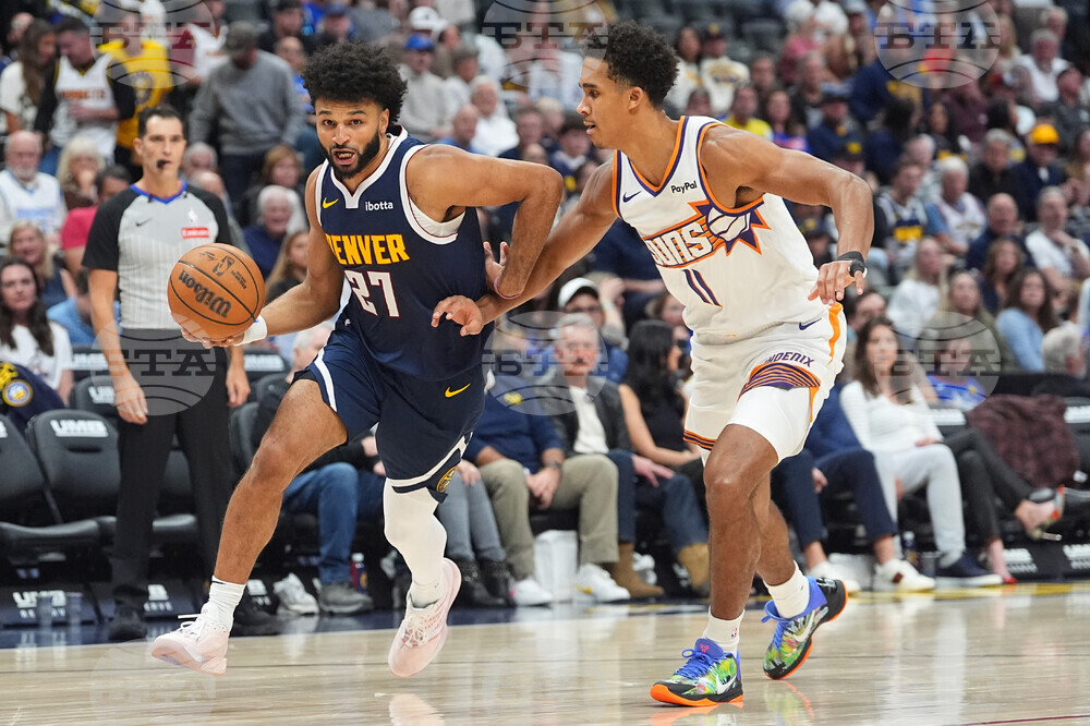 Denver Nuggets guard Jamal Murray, left, drives past Phoenix Suns forward Oso Ighodaro in the second half of an NBA basketball game Saturday, Oct. 25, 2025, in Denver. (AP Photo/David Zalubowski)