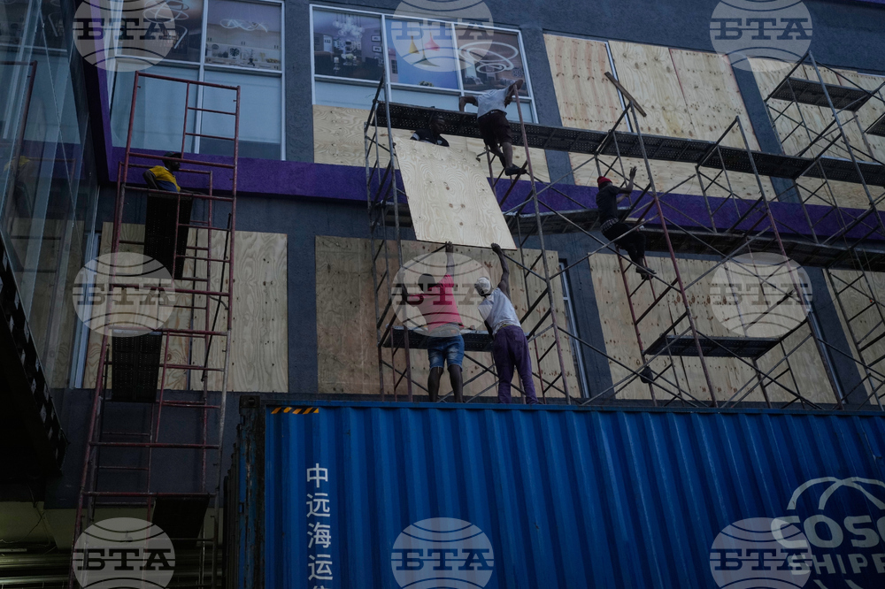 Workers board up shop windows ahead of Hurricane Melissa's forecast arrival in Kingston, Jamaica, Sunday, Oct. 26, 2025. (AP Photo/Matias Delacroix)