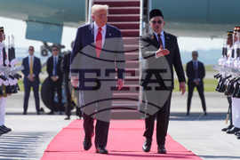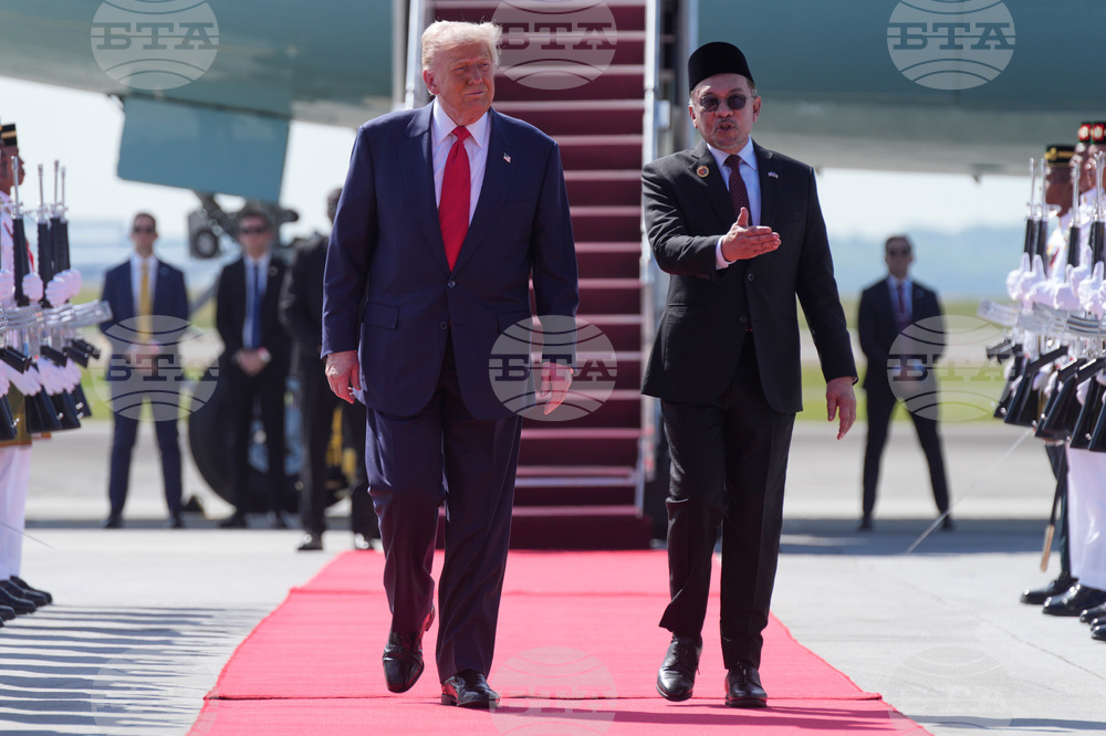 President Donald Trump is introduced to dignitaries by Malaysia's Prime Minister Anwar Ibrahim as he arrives at Kuala Lumpur International Airport in Sepang, Malaysia, Sunday, Oct. 26, 2025. (AP Photo/Mark Schiefelbein)