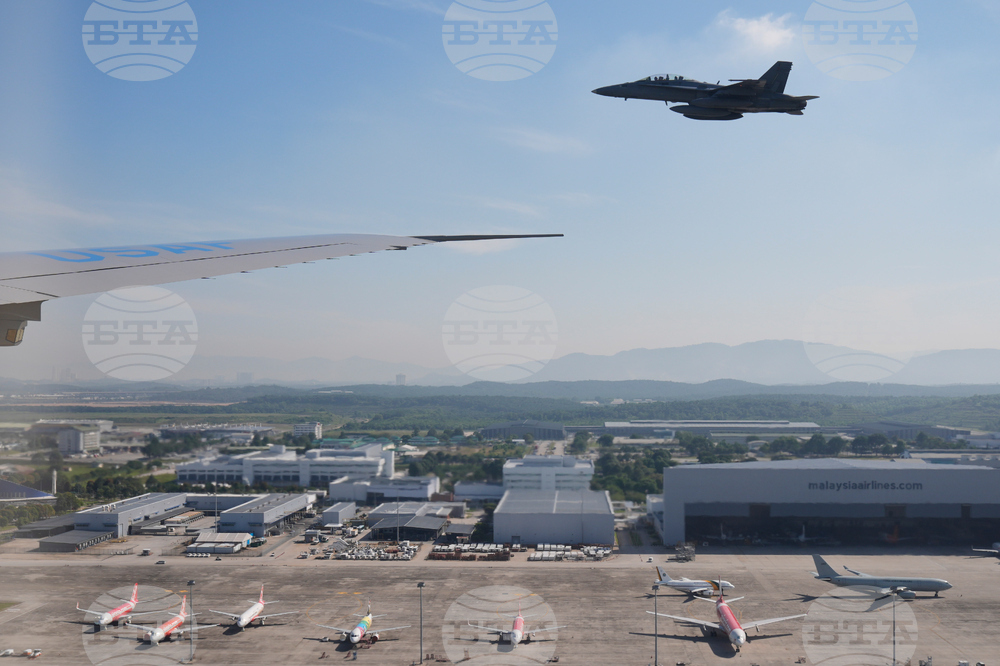 A Malaysian Air Force jet escorts Air Force One into Kuala Lumpur International Airport in Sepang, Malaysia, Sunday, Oct. 26, 2025. (AP Photo/Mark Schiefelbein)