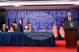 President Donald Trump, speaks during a signing ceremony on the sidelines of the ASEAN Summit in Kuala Lumpur, Malaysia, Sunday, Oct. 26, 2025. (AP Photo/Mark Schiefelbein)