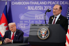 Malaysian Prime Minister Anwar Ibrahim speaks as President Donald Trump watches during a signing ceremony on the sidelines of the ASEAN Summit in Kuala Lumpur, Malaysia, Sunday, Oct. 26, 2025. (AP Photo/Mark Schiefelbein)