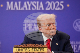 President Donald Trump reacts during a signing ceremony on the sidelines of the ASEAN Summit in Kuala Lumpur, Malaysia, Sunday, Oct. 26, 2025. (AP Photo/Mark Schiefelbein)