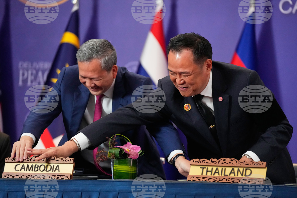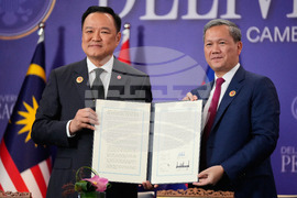 Cambodian Prime Minister Hun Manet and Thailand's Prime Minister Anutin Charnvirakul, left, pose for a photo during a signing ceremony on the sidelines of the ASEAN Summit in Kuala Lumpur, Malaysia, Sunday, Oct. 26, 2025. (AP Photo/Mark Schiefelbein)