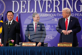 President Donald Trump, reacts as Cambodian Prime Minister Hun Manet and Thailand's Prime Minister Anutin Charnvirakul, left, pose for a photo during a signing ceremony on the sidelines of the ASEAN Summit in Kuala Lumpur, Malaysia, Sunday, Oct. 26, 2025. (AP Photo/Mark Schiefelbein)