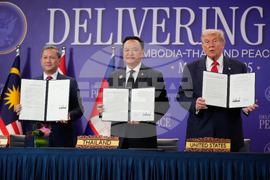 President Donald Trump, Cambodian Prime Minister Hun Manet, left, and Thailand's Prime Minister Anutin Charnvirakul pose with their documents during a signing ceremony on the sidelines of the ASEAN Summit in Kuala Lumpur, Malaysia, Sunday, Oct. 26, 2025. (AP Photo/Mark Schiefelbein)